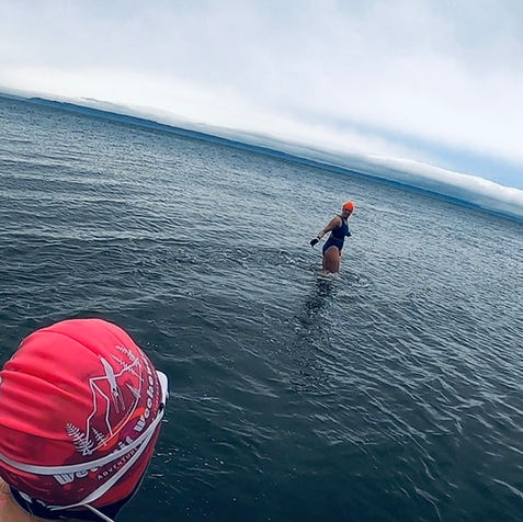 I swam breaststroke through the mud flat/goose poop flat until I could see the clear water again in the distance. Once I got to the clear water, I put my head under again. We swam for another 10 minutes or so, for a total of 24 minutes skins. I was less nervous on this leg of the swim since I'd gotten a bit accustomed to the water already and also we had beach to walk if we needed. The train tracks were still in the distance and rushed by as we swam, which was pretty cool to witness while swimming. We waved to the conductor from the water.